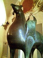 Figures of animals in the round were often acceptable for works used in private contexts if the object was clearly practical, so medieval Islamic art contains many metal animals that are aquamaniles, incense burners or supporters for fountains, as in the stone lions supporting the famous one in the Alhambra, culminating in the largest medieval Islamic animal figure known, the Pisa Griffin. In the same way, luxury hardstone carvings such as dagger hilts and cups may be formed as animals, especially in Mughal art. The degree of acceptability of such relaxations of strict Islamic rules varies between periods and regions, with Islamic Spain, Persia and India often leading relaxation, and is typically highest in courtly contexts.