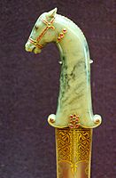 Mughal dagger with hilt in jade, gold, rubies and emeralds. Blade of damascened steel inlaid with gold.