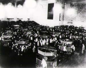 The Wall Street Crash of 1929, also known as the Crash of ’29 or the Great Crash, was the most devastating stock market crash in the history of the United States, taking into consideration the full scope and longevity of its fallout. Three phrases—Black Thursday, Black Monday, and Black Tuesday—are used to describe this collapse of stock values. All three are appropriate, for the crash was not a one-day affair. The initial crash occurred on Black Thursday ( October 24, 1929), but it was the catastrophic downturn of Black Monday and Tuesday ( October 28 and October 29, 1929) that precipitated widespread panic and the onset of unprecedented and long-lasting consequences for the United States. The collapse continued for a month. Economists and historians disagree as to what role the crash played in subsequent economic, social, and political events. The crash in America came near the beginning of the Great Depression, a period of economic decline in the industrialized nations, and led to the institution of landmark financial reforms and new trading regulations. At the time of the crash, New York City had grown to be a major metropolis, and its Wall Street district was one of the world's leading financial centers. The New York Stock Exchange (NYSE) was the largest stock market in the world. The Roaring Twenties was a time of prosperity and excess in the city, and, despite warnings against speculation, many believed that the market could sustain high price levels. Shortly before the crash, Irving Fisher famously proclaimed, "Stock prices have reached what looks like a permanently high plateau." The euphoria and financial gains of the great bull market were shattered Black Thursday, when share prices on the NYSE collapsed. Stock prices fell on that day and they continued to fall, at an unprecedented rate, for a full month.