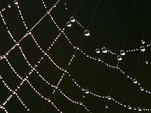Most water vapor over the oceans returns to the oceans, but winds carry water vapor over land at the same rate as runoff into the sea, about 47 Tt per year. Over land, evaporation and transpiration contribute another 72 Tt per year. Precipitation, at a rate of 119 Tt per year over land, has several forms: most commonly rain, snow, and hail, with some contribution from fog and dew. Dew is small drops of water that are condensed when a high density of water vapor meets a cool surface. Dew usually form in the morning when the temperature is the lowest, just before sunrise and when the temperature of the earth's surface starts to increase. Condensed water in the air may also refract sunlight to produce rainbows.