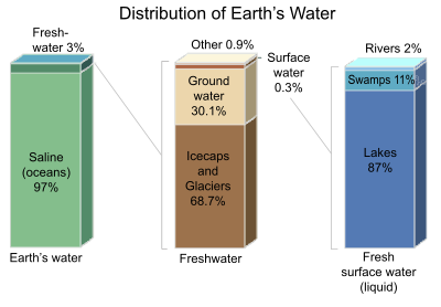 Water covers 71% of the Earth's surface, and is vital for all known forms of life. On Earth, 96.5% of the planet's water is found in oceans, 1.7% in groundwater, 1.7% in glaciers and the ice caps of Antarctica and Greenland, a small fraction in other large water bodies, and 0.001% in the air as vapor, clouds (formed of solid and liquid water particles suspended in air), and precipitation. Only 2.5% of the Earth's water is freshwater, and 98.8% of that water is in ice and groundwater. Less than 0.3% of all freshwater is in rivers, lakes, and the atmosphere, and an even smaller amount of the Earth's freshwater (0.003%) is contained within biological bodies and manufactured products.