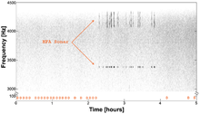 The songs follow a distinct hierarchical structure. The base units of the song (sometimes loosely called the " notes") are single uninterrupted emissions of sound that last up to a few seconds. These sounds vary in frequency from 20 Hz to upward of 24 kHz (the typical human range of hearing is 20 Hz to 20 kHz). The units may be frequency modulated (i.e., the pitch of the sound may go up, down, or stay the same during the note) or amplitude modulated (get louder or quieter). However the adjustment of bandwidth on a spectrogram representation of the song reveals the essentially pulsed nature of the FM sounds.