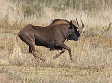 The most striking morphological differences between the black and blue wildebeests are the orientation and curvature of their horns and the color of their coats. The blue wildebeest is the bigger of the two species. In males, blue wildebeest stand 150 cm tall at the shoulder and weigh around 250 kg, while the black wildebeest stands 111 to 120 cm tall and weighs about 180 kg. In females, blue wildebeest have a shoulder height of 135 cm and weigh 180 kg while black wildebeest females stand 108 cm at the shoulder and weigh 155 kg. The horns of blue wildebeest protrude to the side then curve downwards before curving up back towards the skull, while the horns of the black wildebeest curve forward then downward before curving at the upwards at the tips. Blue wildebeest tend to be a dark grey color with stripes, but may have a shiny blue color. The black wildebeest has brown-coloured fur, with a mane that ranges in colour from cream to black, and a cream-coloured tail end. The blue wildebeest lives in a wide variety of habitats, including woodlands and grasslands, while the black wildebeest tends to reside exclusively in open grassland areas. The blue wildebeest migrates over long distances in the winter, whereas the black wildebeest does not. The milk of the female black wildebeest contains higher protein, lower fat, and lower lactose content than the milk of female blue wildebeests.