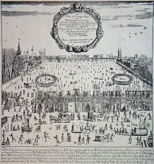 - 1683–1684, "The Great Frost", when the Thames, hosting one of many River Thames frost fairs, was frozen all the way up to the London Bridge and remained frozen for about two months. Ice was about 27 cm (11 in) thick in London and about 120 cm (47 in) thick in Somerset. The sea froze up to 2 miles (3.2 km) out around the coast of the southern North Sea, causing severe problems for shipping and preventing use of many harbors.