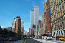 ![]() The first World Trade Centre of New York City in March 2001. The reddish-brown building (back left) is the original 7 World Trade Centre. The North Tower (left), with antenna spire, is 1 WTC. The South Tower (right) is 2 WTC. All 7 buildings are partially visible (see map below). Background shows the East River. |