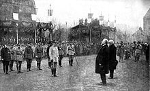 Romania had been allied with the Central Powers since 1882. When the war began, however, it declared its neutrality, arguing that because Austria-Hungary had itself declared war on Serbia, Romania was under no obligation to join the war. When the Entente Powers promised Romania large territories of eastern Hungary ( Transylvania and Banat), which had a large Romanian population, in exchange for Romania's declaring war on the Central Powers, the Romanian government renounced its neutrality and, on 27 August 1916, the Romanian Army launched an attack against Austria-Hungary, with limited Russian support. The Romanian offensive was initially successful, pushing back the Austro-Hungarian troops in Transylvania, but a counterattack by the forces of the Central Powers drove back the Russo-Romanian forces. As a result of the Battle of Bucharest, the Central Powers occupied Bucharest on 6 December 1916. Fighting in Moldova continued in 1917, resulting in a costly stalemate for the Central Powers. Russian withdrawal from the war in late 1917 as a result of the October Revolution meant that Romania was forced to sign an armistice with the Central Powers on 9 December 1917.