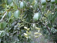 Dioscorea bulbifera, the "air potato", is found in both Africa and Asia, with slight differences between those found in each place. It is a large vine, 6 meters (20 ft) or more in length. It produces tubers; however the bulbils which grow at the base of its leaves are the more important food product. They are about the size of potatoes (hence the name "air potato"), weighing from 0.5 to 2 kg (1 to 5 lbs).
