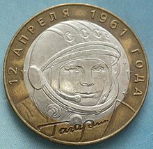 There were two commemorative coins issued in the Soviet Union to honour the 20th and 30th anniversaries of his flight: 1 ruble coin (1981, copper-nickel) and 3 ruble coin (1991, silver). In 2001, to commemorate the 40th anniversary of Gagarin's flight, a series of four coins bearing his likeness was issued in Russia: 2 ruble coin (copper-nickel), 3 ruble coin (silver), 10 ruble coin (brass-copper, nickel), and 100 ruble coin (silver). In 2011, Russia issued a 1,000 ruble coin (gold) and 3 ruble coin (silver) to mark the 50th anniversary of his flight.