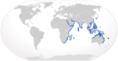 The zebra shark occurs in the tropical waters of the Indo-Pacific region, from South Africa to the Red Sea and the Persian Gulf (including Madagascar and the Maldives), to India and Southeast Asia (including Indonesia, the Philippines, and Palau), northward to Taiwan and Japan, eastward to New Caledonia and Tonga, and southward to northern Australia.